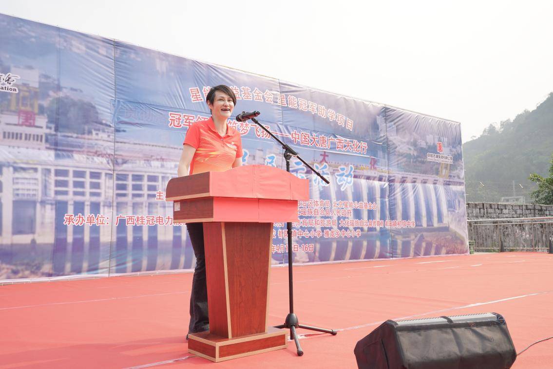 广西桂冠电力股份有限公司党委副书记、董事、工会主席蔡爽发言中提到:中国大唐与星能公益基金会第三次携手举办“奥运冠军进校园”活动。并向远道而来、传递榜样力量的奥运冠军和教练员们致以最热烈的欢迎与诚挚感谢,本次活动是以跨越山海的情谊为孩子们照亮梦想、播撒希望。