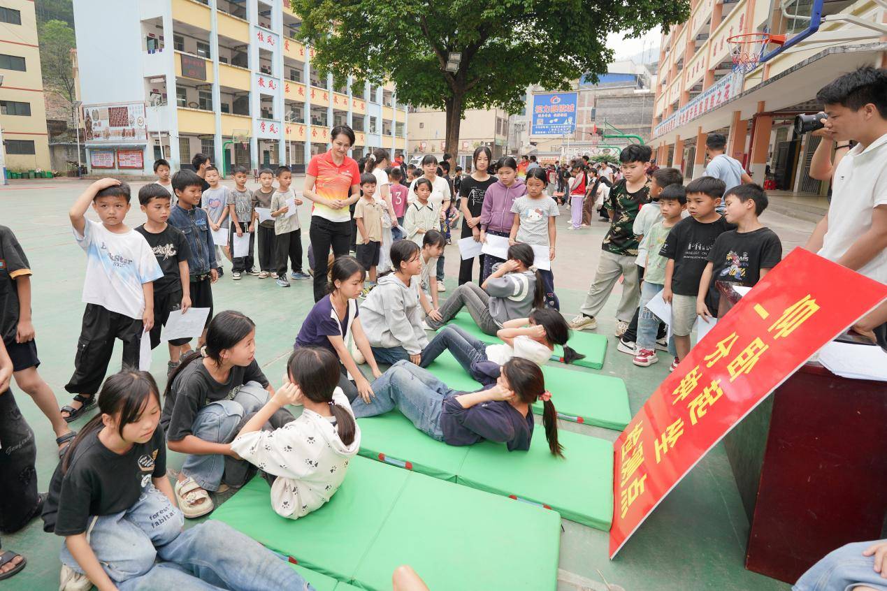 基金会创始人、跳水奥运冠军高敏带领老师和学生共同进行了一场仰卧起坐比赛,现场气氛热烈且紧张。