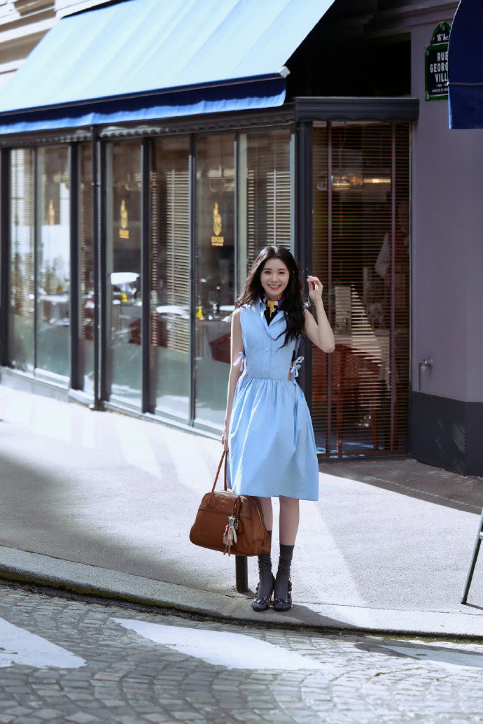 配饰选择堪称点睛:手持普拉达经典 Saffiano 杀手包,方正廓形与服装的柔和线条形成巧妙平衡,金属双拉链细节呼应夹克的利落感;脚踩裸色低跟鞋,弱化鞋履存在感的同时延伸腿部线条,整体造型无过多繁复装饰,却在材质碰撞与比例拿捏中尽显高级感。妆容以清透裸妆为主,眉形柔和自然,唇色选用低饱和豆沙色,与穿搭的文艺氛围形成完美呼应。