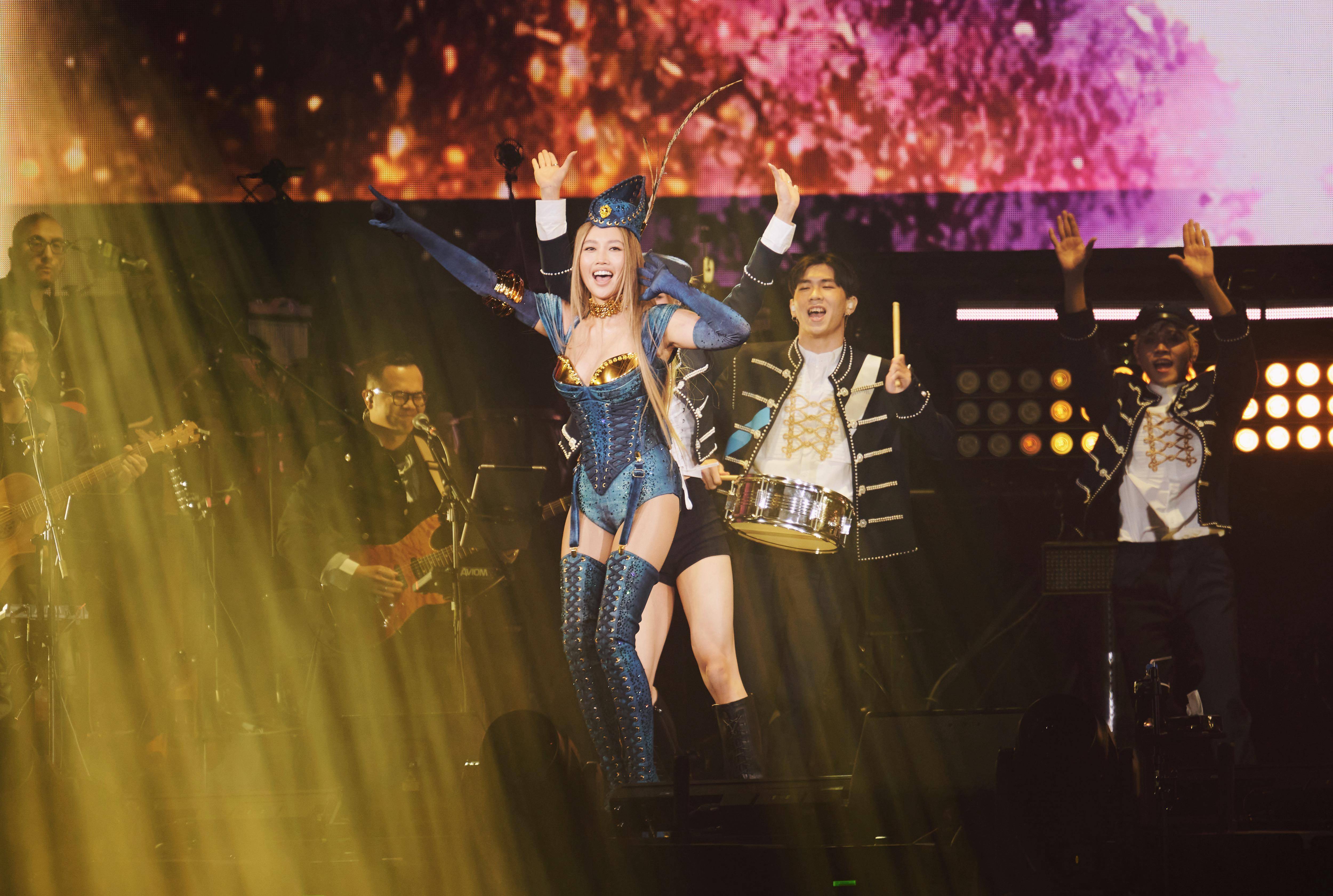 本次佛山站的演出作为A-Lin出道20周年全新主题巡演的首站,舞美、视觉与造型、曲目歌单等巡演主题一众细节全面升级焕新。舞台视觉上,全程赋能的全熄屏裸眼3D大屏成为一大亮点,光影的极致聚焦与跃然而出的立体视效,极大地强化了观众的视觉体验,为舞台赋予属于A-Lin的生命力。象征时间轮回与音乐旅程的环形装置,与每一套精准贴合曲目气质的造型相得益彰,共同构建出一个富有叙事感的表演空间。演唱会以《失恋无罪》《海洋之心》震撼开场,A-Lin身着一套蓝色美人鱼造型亮相,舞美意境与歌曲高度契合,瞬间将观众带入沉浸氛围。此造型在《Romadiw》《一想到你呀》等曲目中延续,全员蓝色系舞美亮眼吸睛,欢快旋律与灵动视觉相得益彰,凭借极高适配度与舞台感染力,成为标志性亮点。
