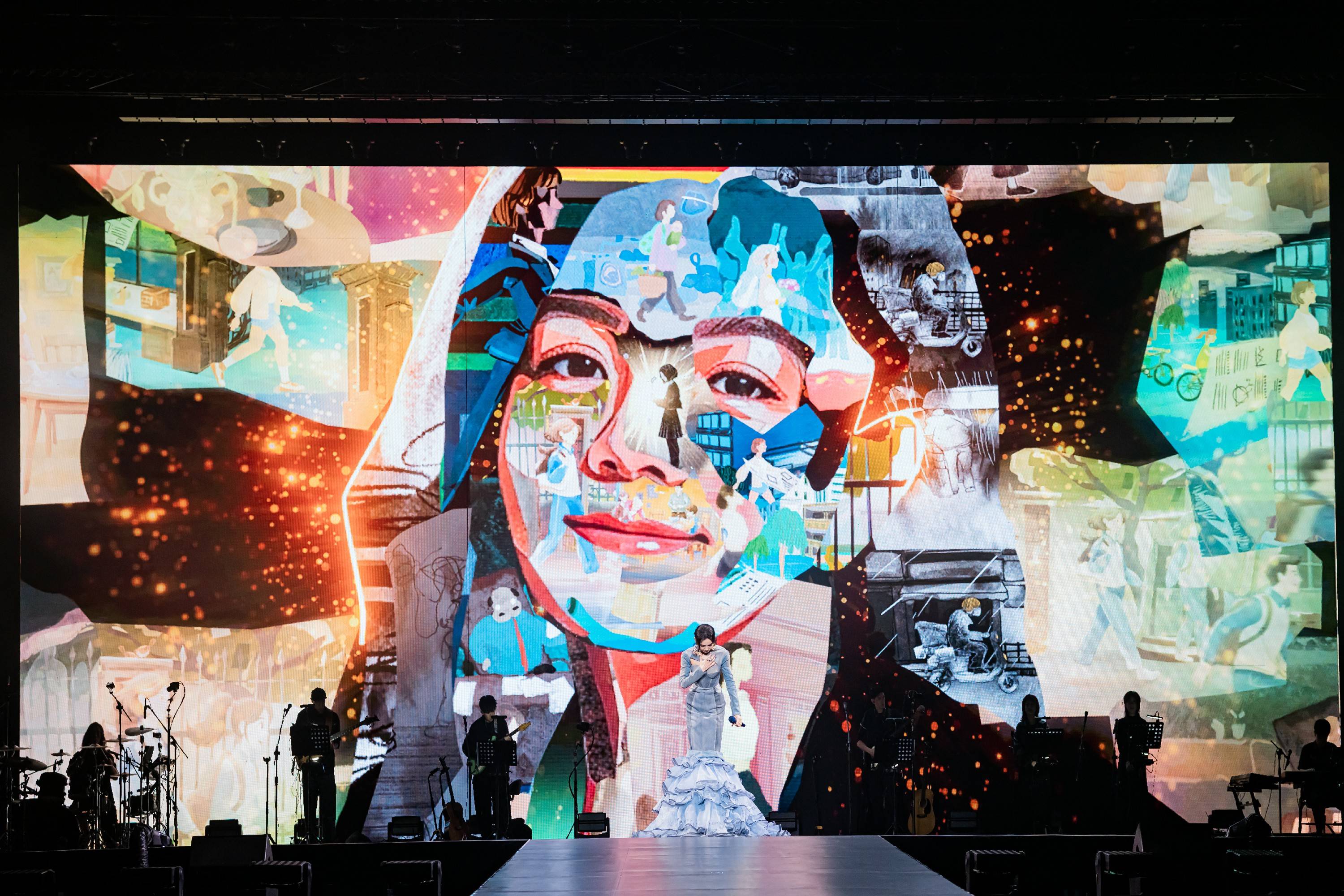 西安站又一感人的惊喜是——《你曾是少年》全新打造的动画VJ。画面以成长意象引发歌迷强烈共鸣,少女一路向前,从青涩学生蜕变为独当一面的职业女性,穿越人生路上的灰暗与荆棘最终奔赴光明,与年少的自己相拥,最终所有动画场景拼接融合,化作Ella的脸,唤醒现场歌迷的青春记忆。演唱这首歌前,Ella分享了她的深切感悟,呼吁观众守护好心中那个对世界充满好奇的少年,不要在逐梦路上磨平最初的热情,戳中了全场观众的成长心事。