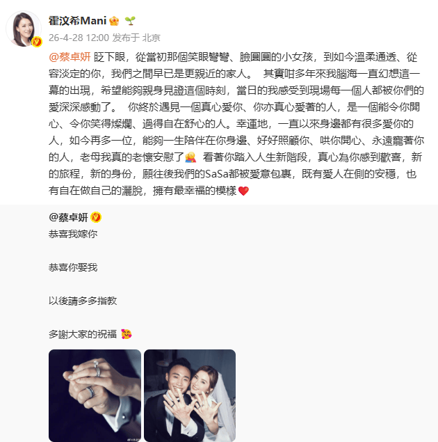 2026年4月28日,蔡卓妍(阿Sa)正式官宣结婚喜讯,迎来人生全新幸福篇章。作为一路陪伴她成长、见证她蜕变的至亲好友,英皇(北京)文化发展有限公司行政总裁、香港英皇娱乐集团营运总裁霍汶希第一时间发布走心长文,为阿Sa送上最真挚、最温暖的新婚祝福,字里行间满是疼爱与欣慰,两人二十余年的深厚情谊也随之触动无数网友。